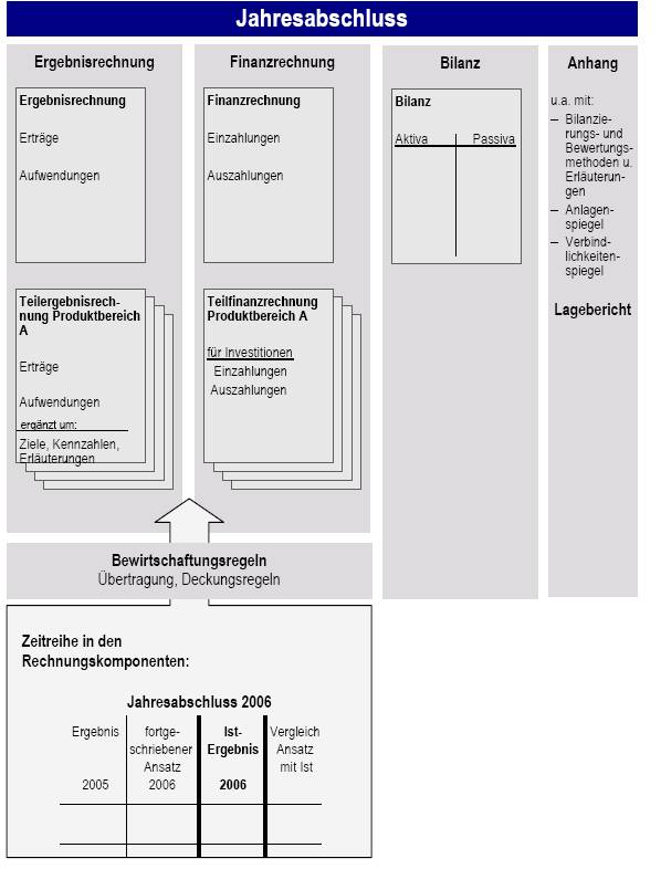 Der Haushaltsplan ist mit dem Jahresabschluss nicht vergleichbar: der Jahresabschluss ist das Gegenstück zum Haushaltsplan. Der Haushaltsplan beinhaltet die planerischen Größen, während der Jahresabschluss eine ist-mäßige Betrachtung liefert. Regelungen zum Jahresabschluss ergeben sich aus den §§ 95 und 96 GO sowie den §§ 37 bis 48 GemHVO. ![]() Quelle: http://www.neues-kommunales-finanzmanagement.de/dokumente/NKF%20Foliensatz-Feb-05-kurz.pdf
