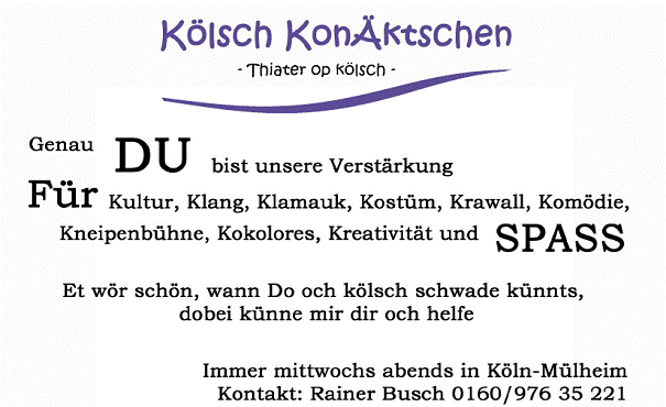 noch MitspielerInnen. Wer Kölsch spricht, Zeit und Spaß an der Freud mitbringt,