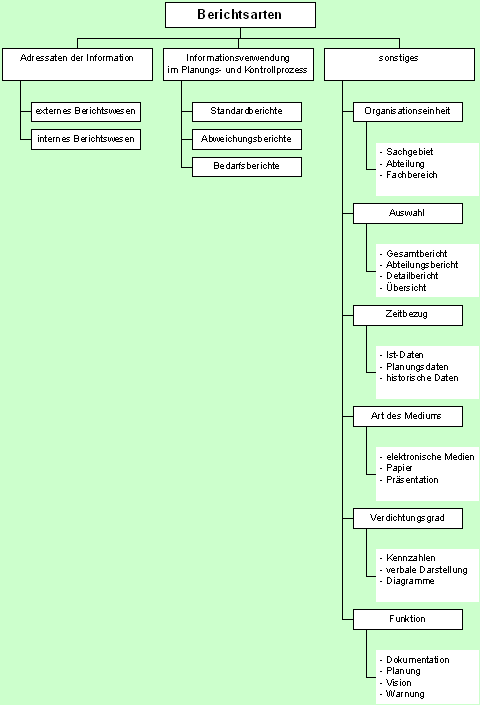 Unter Berichtswesen versteht man ein betriebliches Informationssystem (Management-Informationssystem)[1], das den Entscheidungsträgern die zur Erfüllung ihrer Aufgaben benötigten Daten zur Verfügung stellt. Ein Berichtswesen umfasst grundsätzlich Informationen über alle wesentlichen betrieblichen Vorgänge. Darüber hinaus werden meist auch unternehmensexterne Daten einbezogen, um den ökonomischen Standort auf dem jeweiligen Markt transparent zu machen. Auf der einen Seite erhalten die Fachbereiche weitergehende Kompetenzen bzgl. der Ressourcen (Personal, Finanzen). Auf der anderen ist es für die delegierende Stelle bzw. die Verwaltungs- / Unternehmensleitung interessant und wichtig nachzuvollziehen, wie mit dieser Verantwortung umgegangen wird. Insoweit kann man auch bei dem Berichtswesen „von der Kehrseite der Medaille“ bzgl. Budgetierung und dezentraler Ressourcenverantwortung sprechen.