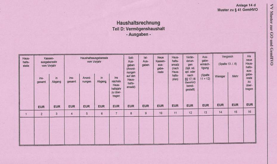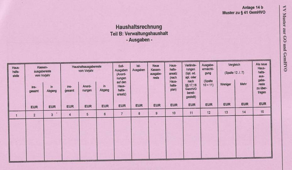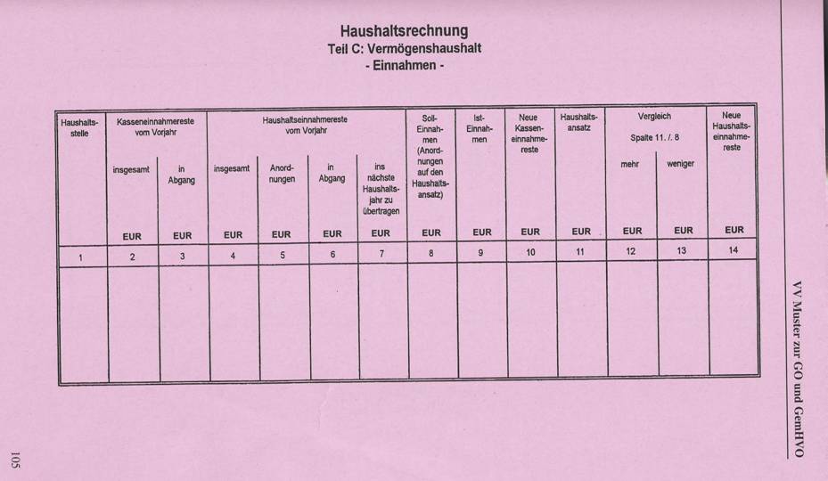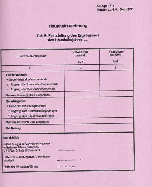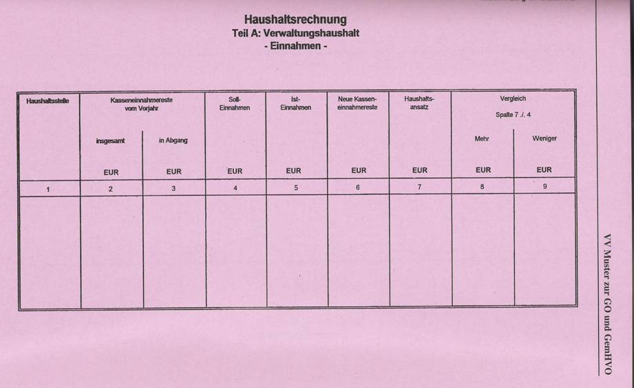 ![]() Die Abrechnung der Verwaltungskameralistik beruht auf dem Soll-Prinzip. Eine "Soll-Stellung" kennen andere Rechnungssysteme nicht. Damit ist gemeint, dass die Verwaltungsbereiche die Gemeindekasse anweist (durch Kassenanordnungen) bestimmte Einnahmen und Ausgaben zum Soll zu stellen. Beispiel: Herr A muss seine Grundsteuer i.H.v. 400 € bezahlen (eine Einnahme für die Stadt X); das Steueramt weist die Stadtkasse an (durch Kassenanordnung). Die Stadtkasse nimmt eine Soll-Stellung vor, d.h. der Betrag i.H.v. 400 € wird - vergleichbar in der Doppik - als Forderung gebucht. Erst wenn der Betrag gezahlt wird muss die Stadtkasse neben der Sollbuchung auch eine Ist-Buchung vornehmen. Die Stadt X muss an den Bauunternehmer B eine Abschlagzahlung von 5.000 € zahlen. Der Fachbereich weist die Stadtkasse an (durch Kassenanordnung). Die Stadtkasse nimmt eine Soll-Stellung vor, d.h. die Ausgabe wird zum Soll angeordnet. Erst nach dem ist-mäßigen Abfluss wird die Istbuchung durch die Stadtkasse vorgenommen. Aus dem obigen Muster der Haushaltsrechnung wird nun deutlich, dass die Soll-Stellungen das Ergebnis des Haushaltes beeinflussen und zwar unabhängig von dem ist-mässigen Abfluss. Die stellt das Gesamtergebnis dar. Die Haushaltsrechnung ist für jede Haushaltsstelle durchzuführen und zwar wiederum getrennt nach Verwaltungs- und Vermögenshaushalt und nach Einzelplänen. Auch hierfür gibt es Muster.