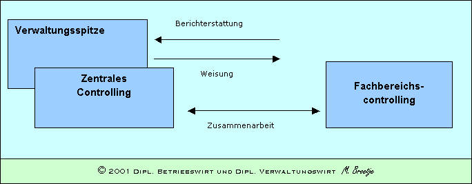 Der Begriff des zentralen Controlling verfolgt die organisatorische Konzeption das Controlling zentral an einer Stelle der Verwaltung einzugliedern. „Zentrales Controlling ist im wesentlichen für die Koordination der Fachplanungen der Fachbereiche, für die Gestaltung des zentralen Berichtswesens, für Abweichungsanalysen und vorzuschlagende Konsequenzen der Berichterstattung, für Beteiligungs-Controlling und für die Koordination der Langfristinformationen verantwortlich.“[1] Der Begriff des dezentralen Controlling verfolgt hingegen die organisatorische Konzeption das Controlling dezentral an mehreren Stellen der Verwaltung einzugliedern. Es ist jedoch zu berücksichtigen, dass durch die Neuen Steuerungsmodelle ein wesentlicher Leitgedanke die “dezentrale Ressourcenverantwortung” ist, so dass wohl auch das Controlling dezentral, d.h. fachbereichsbezogen, zu organisieren ist. Das dezentrale Controlling kann man auch als sogen. Fachbereichscontrolling oder Bereichscontrolling bezeichnen. Bei einer reinen dezentralen Ausrichtung des Controlling wird auf ein zentrales Controlling verzichtet. „Stattdessen würden den Fachbereichen jeweils fachlich und disziplinarisch unterstellte Vor-Ort-Controller zugeordnet. Solche Controller wären mit den Problemen des jeweiligen Fachbereiches wohlvertraut und könnten ihre Instrumente genau auf die Bedürfnisse des Fachbereiches zuschneiden.“[2] Diesem Vorteil steht der Nachteil gegenüber, dass die Fachbereichscontroller nur die Belange ihres Fachbereiches vertreten und interessieren und die Gesamtbelange und Gesamtinteresse des Betriebes bzw. der Verwaltung unberücksichtigt bleiben. Aus der nachstehenden Abbildung